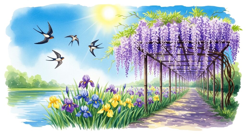 • 燕(つばめ) :春から夏にかけて見られますが、5月は子育ての真っ最中。親鳥が忙しく飛び回る姿は、生命の営みを感じさせます。